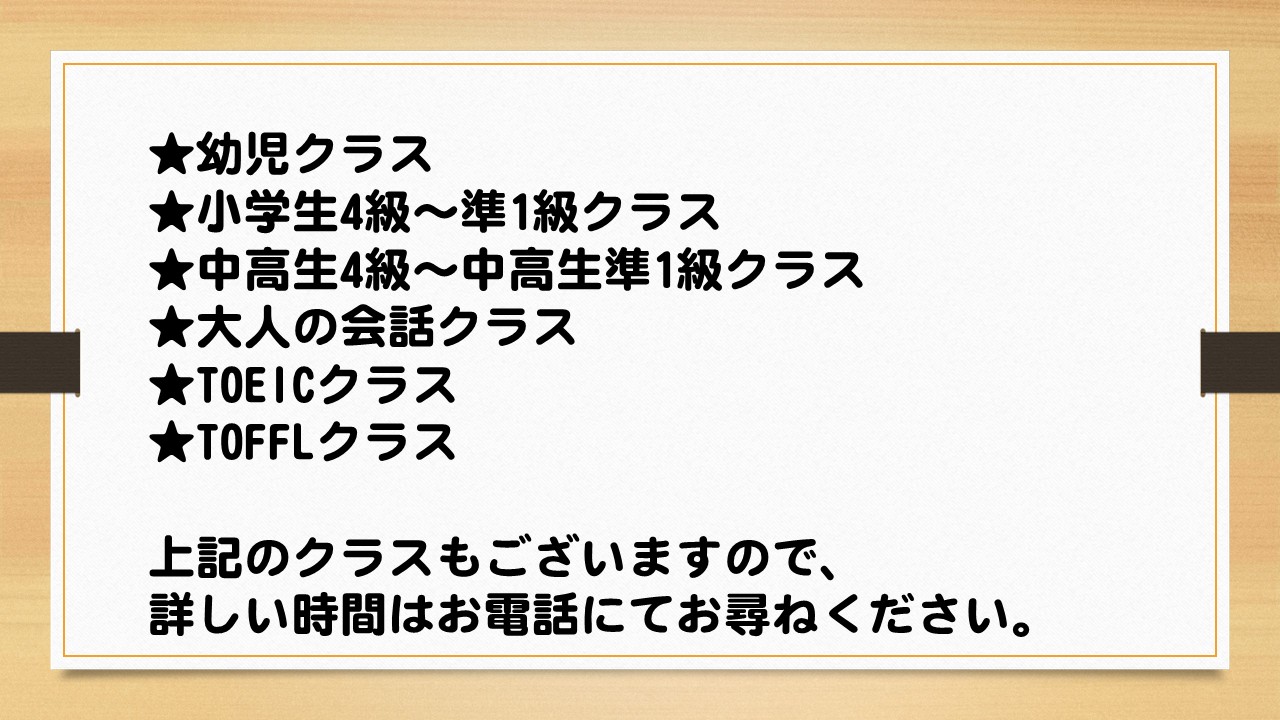 授業内容やクラスの詳細などのご質問もお受けいたしますのでお気兼ねなくお電話ください。