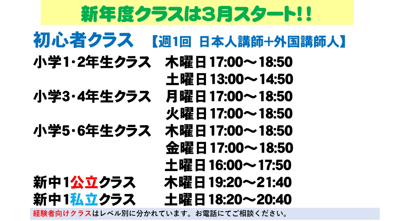 当スクールでは台風や大雪などの自然災害で生徒の皆様の安全を確保するのが難しいと判断した場合、またその他の事情で休校せざるを得ないと判断した場合、急遽休校となることがございます。休校の場合は各家庭への電話連絡は行わず、当日の正午までに当ホームページにて告知を致しますので、ご確認をお願い致します。また、在校生の方へは「れんらくアプリ」を通じてもご連絡いたします。