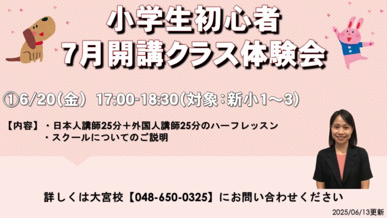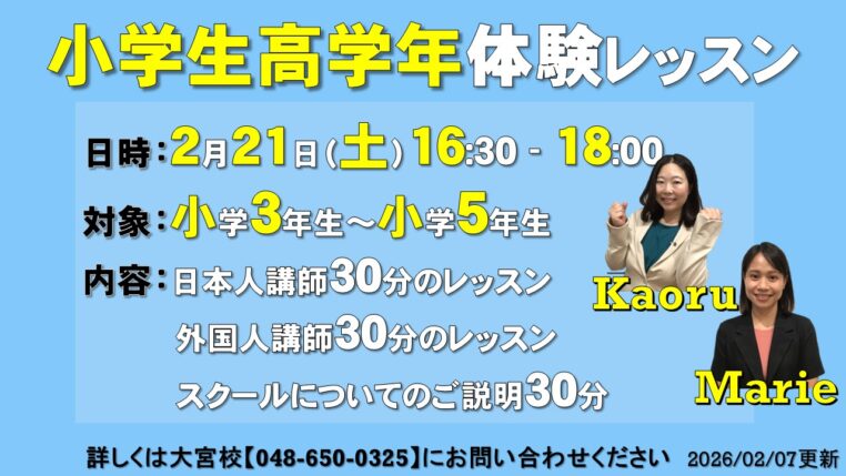 - It is never too late to learn! 何かを始めるのに、遅すぎることはありません!英語に興味を持つ、それこそが修得の近道です。皆さんが英語を好きになる、そのお手伝いができれば幸せです。ご来校を校舎にてお待ちしております!