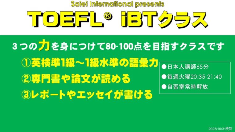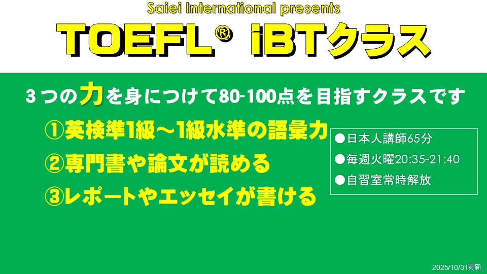- At Saiei, I'm not only solving questions, but also I can have English conversations and debates with other students and teachers. サイエイでは、問題演習のみならず、他の生徒さんや先生と英会話を楽しんだり、ディベートをすることができます。