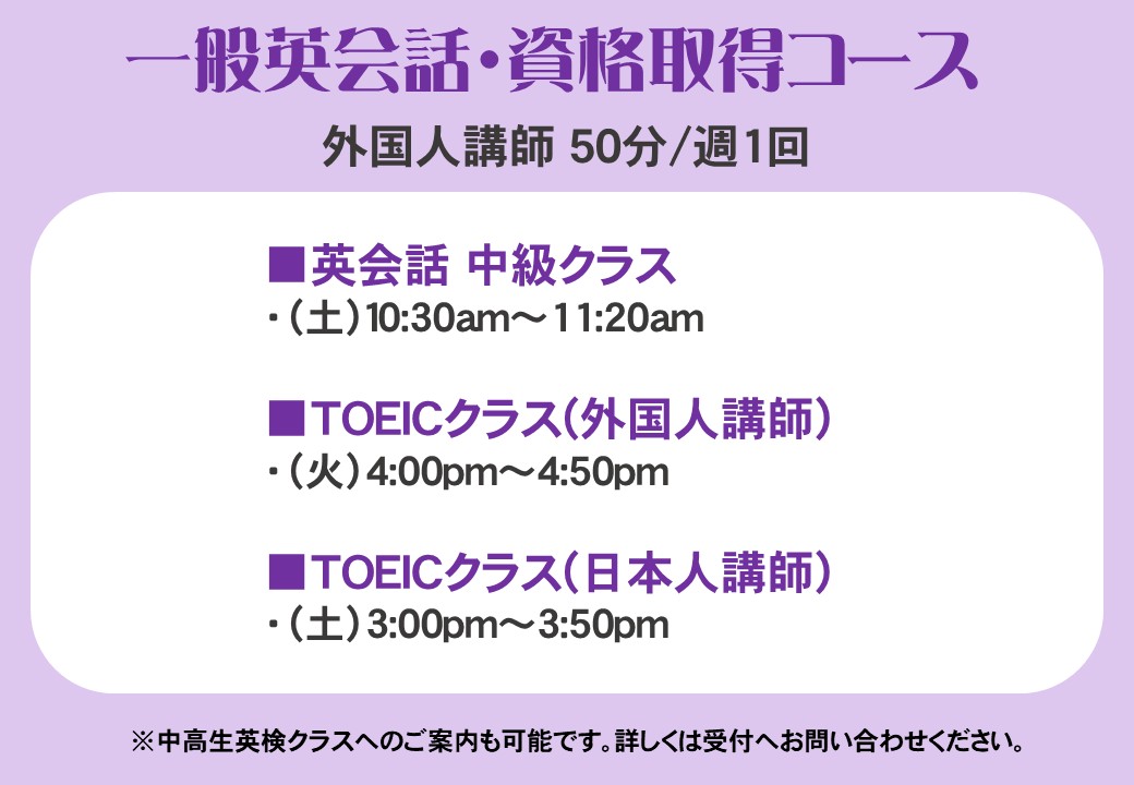 *わかりやすく英検レベルでの表記となっておりますが、クラス自体は英会話・英文法・英検(中高生は+学校のテスト対策)の3~4本立てで実施しております。
